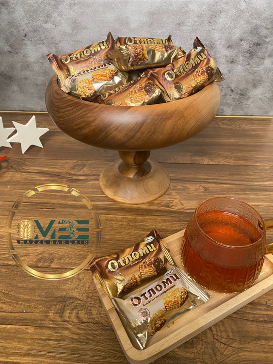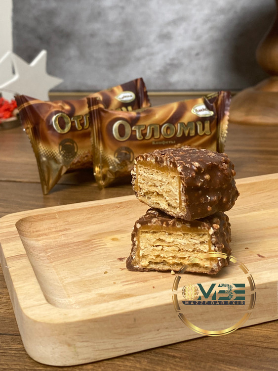 ویفر با کرم کارامل ویژه روکش شکلاتی با عطر کاکائوی بی نظیر حاوی تکه های بادام زمینی ترکیب تازه و جذاب محصول روسیه