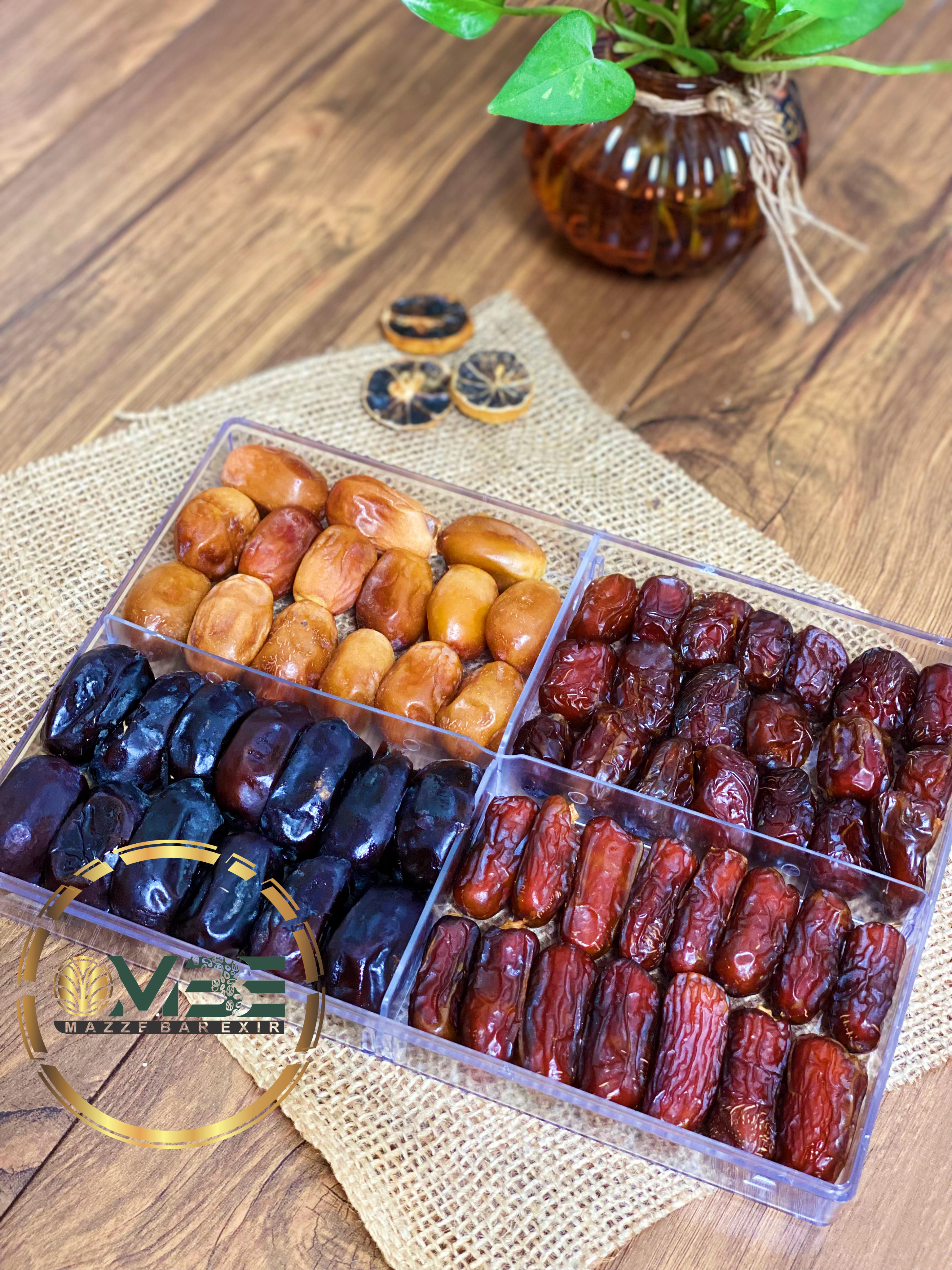 این پک شامل چهار مدل خرمای پرطرفدار ایران است که هر کدام طعمی منحصربهفرد، خواص ارزشمند و بافتی متفاوت دارند. ترکیب این چهار خرمای ممتاز در یک بستهبندی کریستالی و لوکس، محصولی مناسب برای مصرف روزانه، مهمانیها، هدیه و سبدهای سلامت فراهم کرده است.
